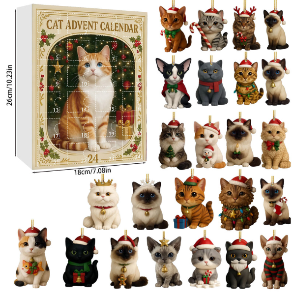Šis advento kalendorius sukurtas visiems, kurie myli kates ir Kalėdas. Už kiekvieno iš 24 langelių slepiasi unikali, akrilo dekoracija su skirtinga kačių veisle – nuo pūkuoto Meino meškėno iki elegantiško Siamo.