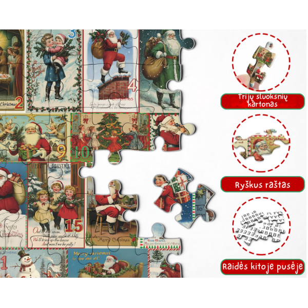 • Turinys: 24 dėlionės dalys (viena kiekvienai advento dienai).