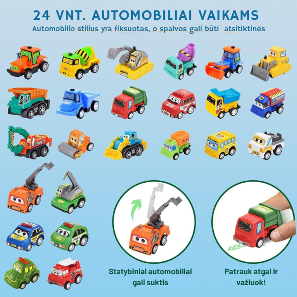 • Rinkinys: 24 x atbulinės eigos automobiliai